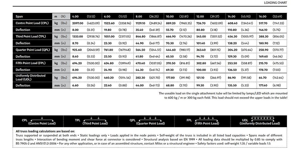 Pinyuan 390 LED Truss Loading Chart, CPL TPL UDL QPL FPL Load Capacity Data for Stage Safety