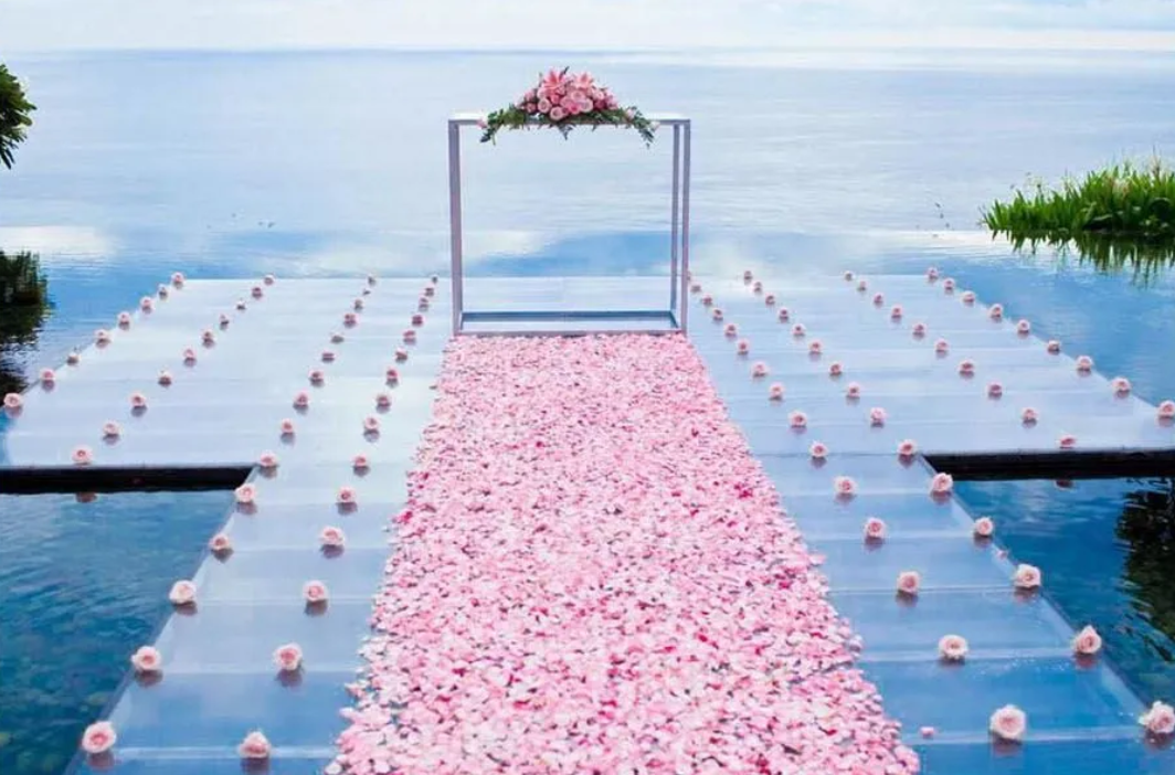 Unlike standard plywood stages, our acrylic wedding stage is fully waterproof, designed to withstand long-term water exposure without damage, making it the ultimate choice for pool and oceanfront weddings. The finished setup comes complete with stable modular frames, ensuring safety and stability while delivering an airy, elegant atmosphere that plywood stages cannot match.