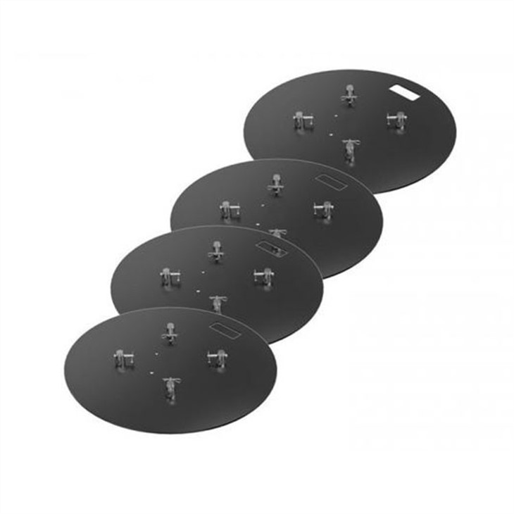 Black circle base for truss is usually used for indoor truss tower. It can be made of steel or aluminum material. The dia of the base is avaible according to the truss’s size. 600x600mm 0r 800x800mm is the standard sizes for truss 300x300mm and 400x400mm. The thickness of the base is 8mm, 10mm or 12mm.