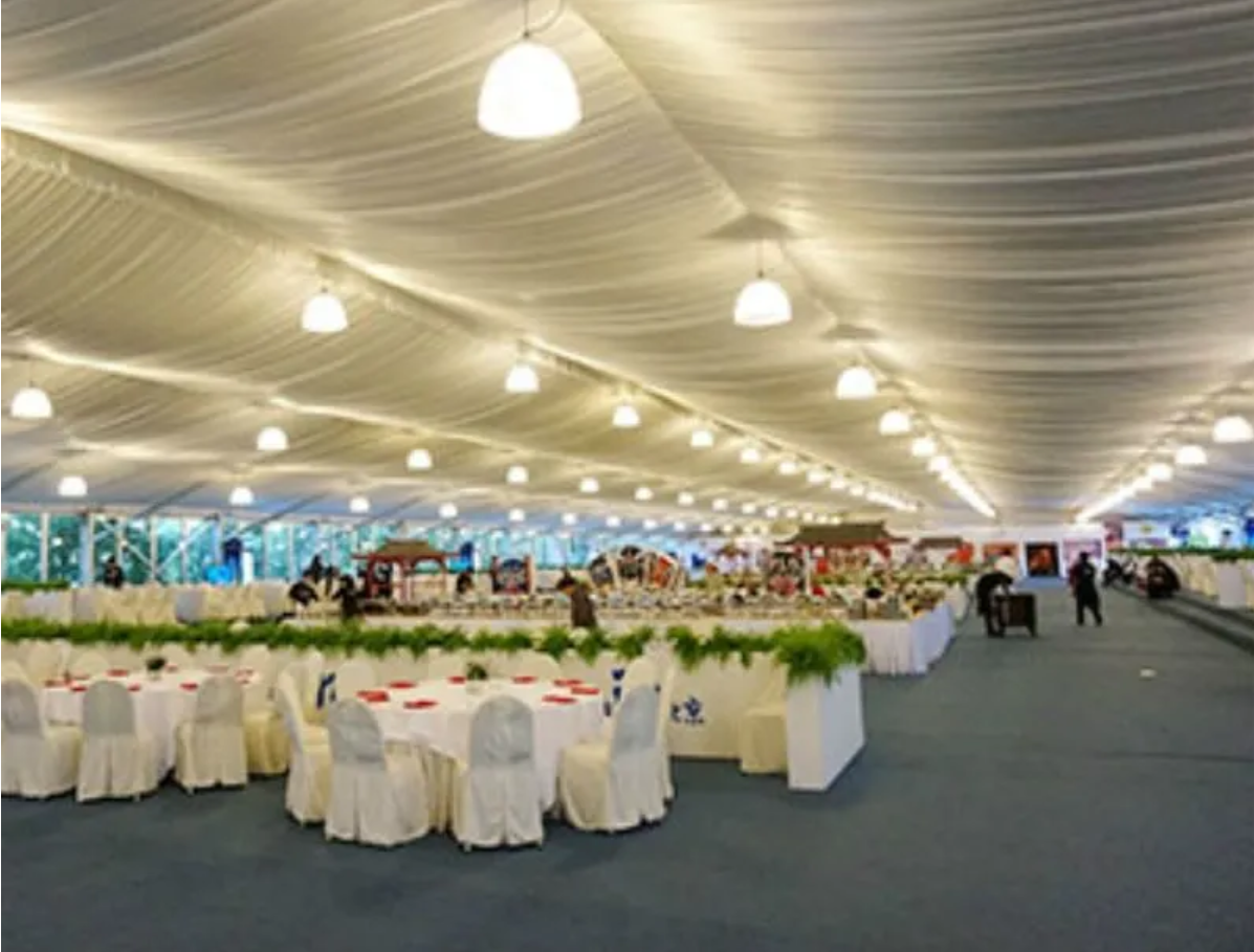 This large outdoor wedding reception tent is the perfect shelter for 100-300 guests, designed to elevate your wedding ceremony and banquet. The spacious, fully customizable interior can be elegantly decorated with ceiling drapes, lighting, and seating arrangements, creating a luxurious banquet space that blends outdoor scenery with hotel-level comfort.